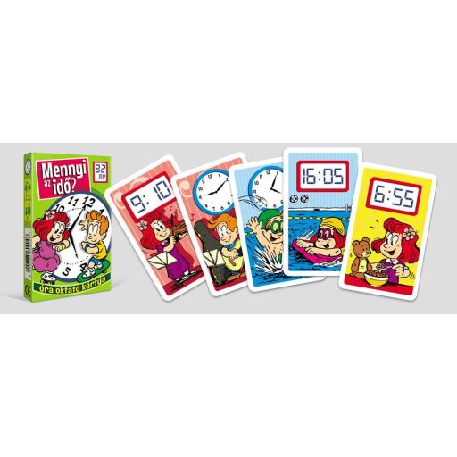 Az óra oktató kártya bemutatja az időpontok megjelenítése közötti különbséget, analóg és a digitális formában. A kártyákon az adott időpontra jellemző tevékenység ábrázolása segít! Fekete Péter és memória szabállyal is játszható. 32 lapos